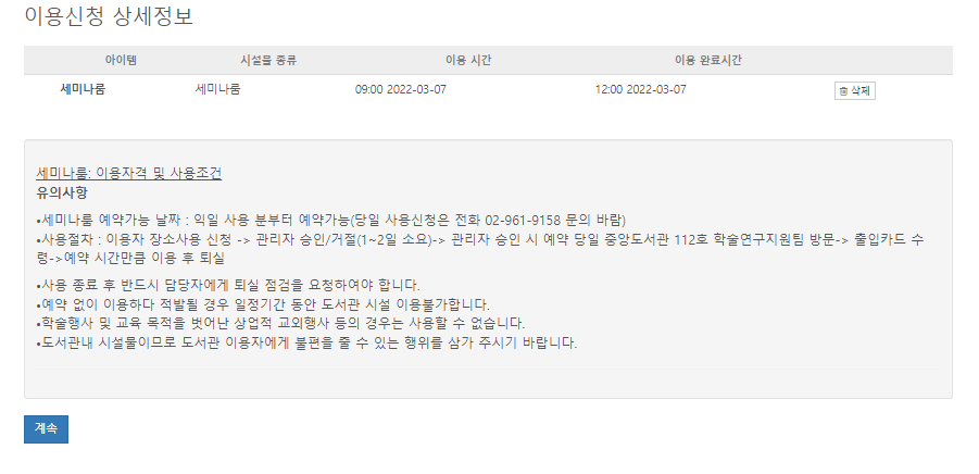 세미나룸 예약시간 선택 4. 날짜와 시간을 모두 선택했다면 이용신청 버튼을 눌러 이용신청 상세정보와 이용 자격 및 사용조건을 확인한 후 계속 버튼을 눌러 신청자 상세정보를 입력해줍니다.