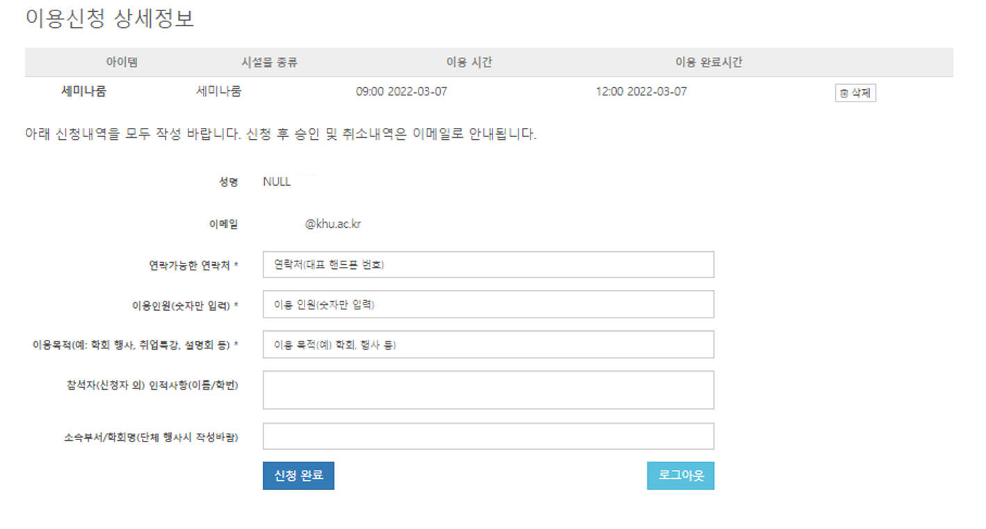 ✅세미나룸은 승인 후 이용해야 하는 시설인 만큼 당일 예약은 되지 않습니다. 당일 예약을 원하는 분들은 학술연구지원팀(02) 961-0072)로 전화 주시기 바랍니다.