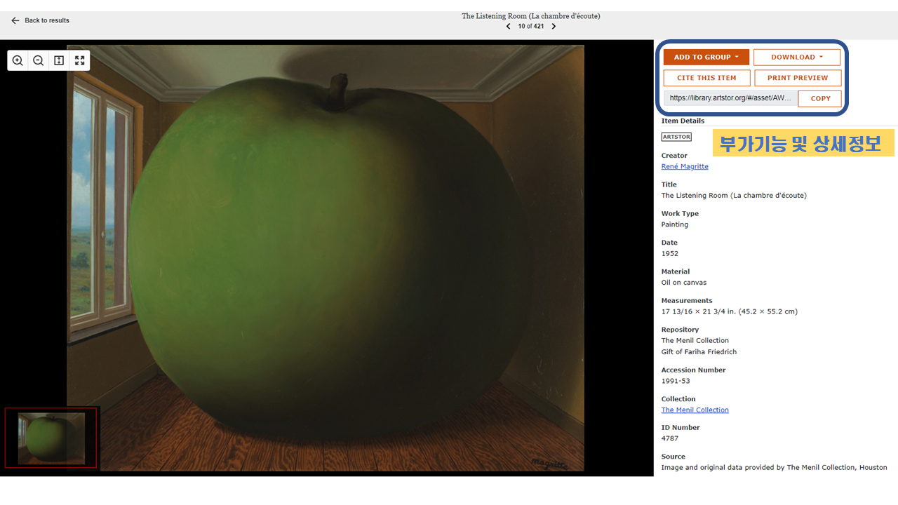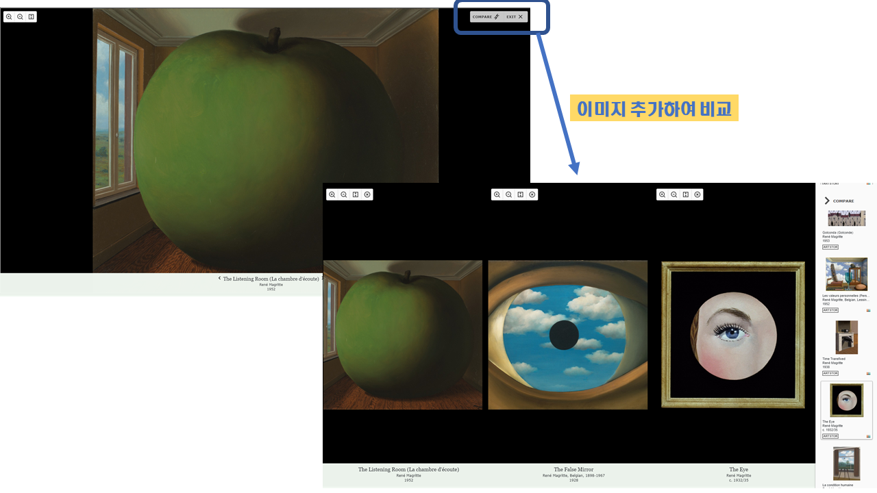 예를 들어 '르네 마그리트'로 검색하는 경우, 검색결과를 썸네일로 확인할 수 있습니다.