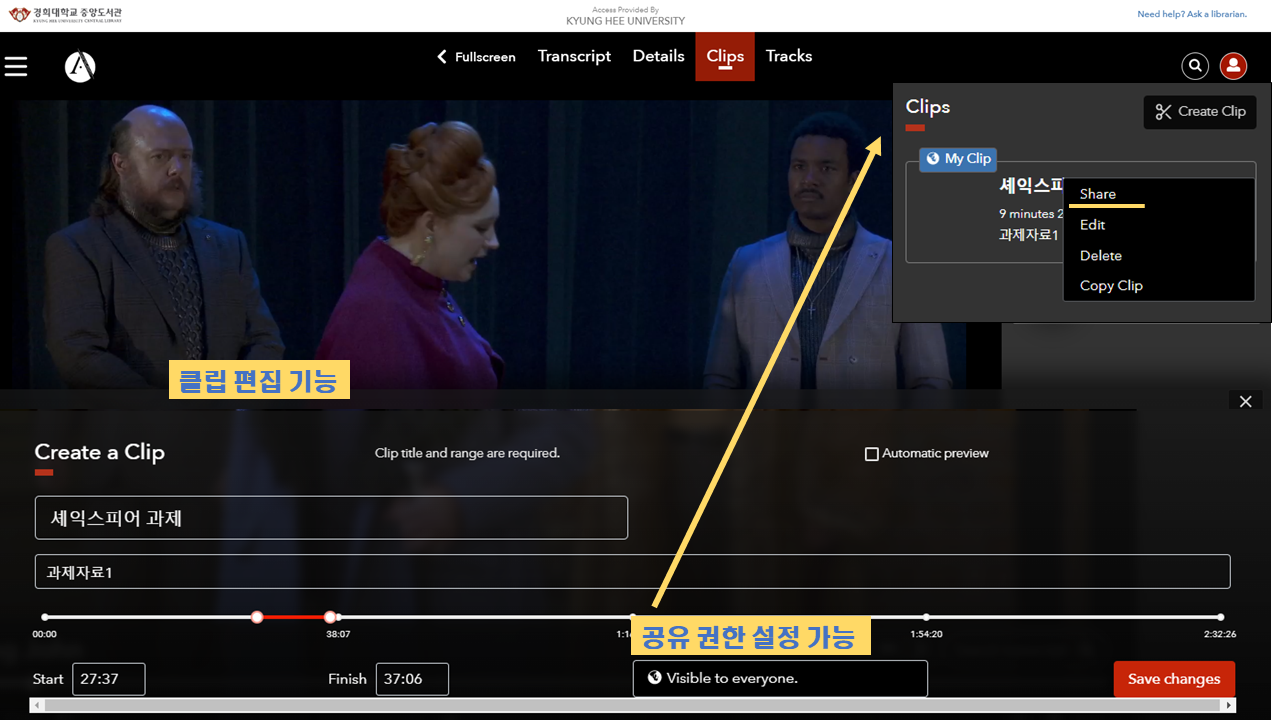 특히, 동영상 공유 기능이 무척 편리하게 되어있어 본인이 원하는 클립을 저장할 수 있고, 저장할 때 공유권한을 "visible to everyone"으로 설정한 후 공유기능을 활용하면 해당 클립의 링크와 임베드 코드를 확인할 수 있습니다.