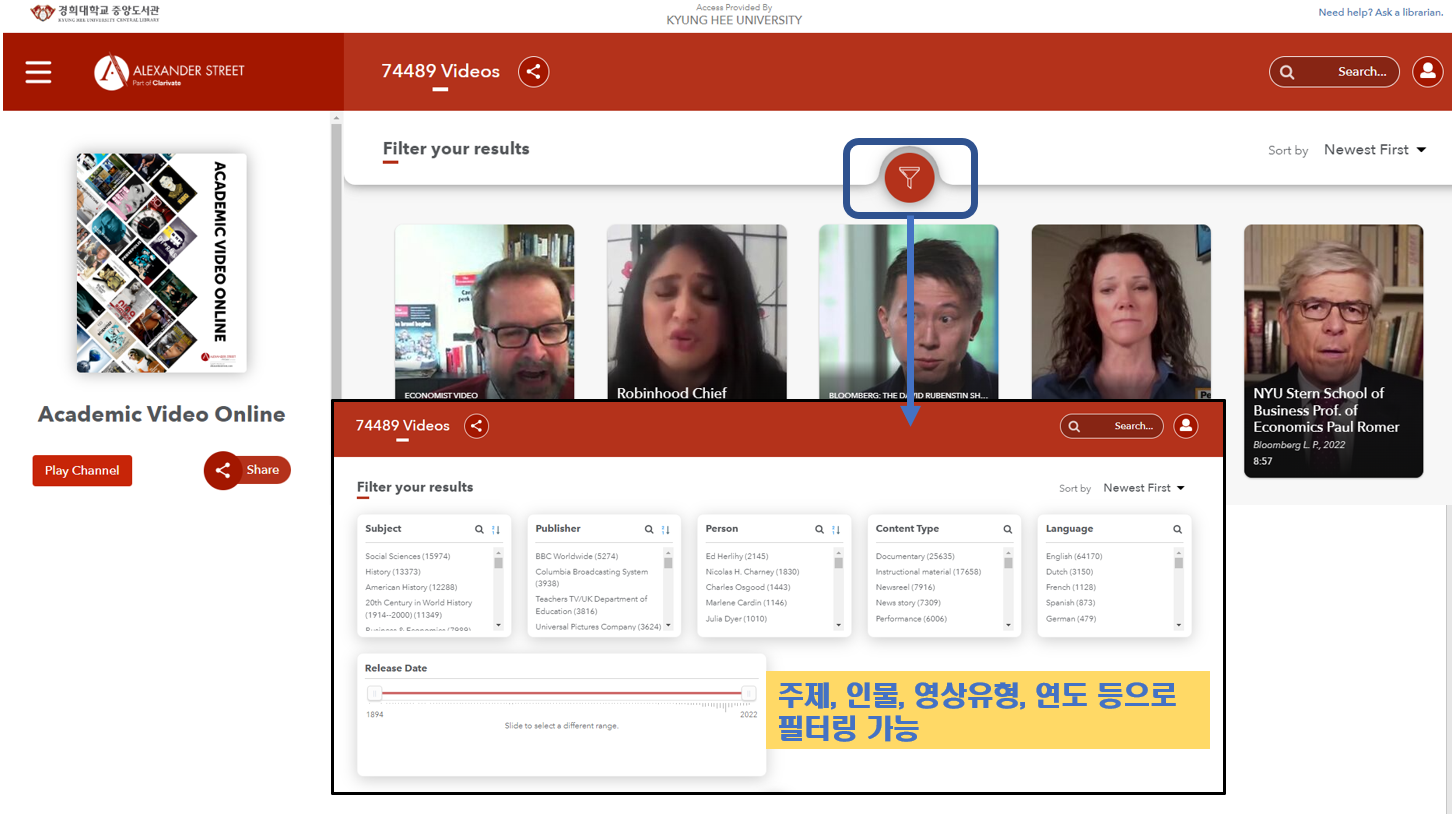 Avon은 2017년부터 KERIS 국가라이선스를 통해 제공되고 있는 비디오 스트리밍 서비스입니다. 7만4천여편 이상에 달하는 자료를 제공하고 있으며, 다큐멘커리, 교습자료, 인터뷰, 공연실황 등 다양한 학술용 자료를 제공합니다.