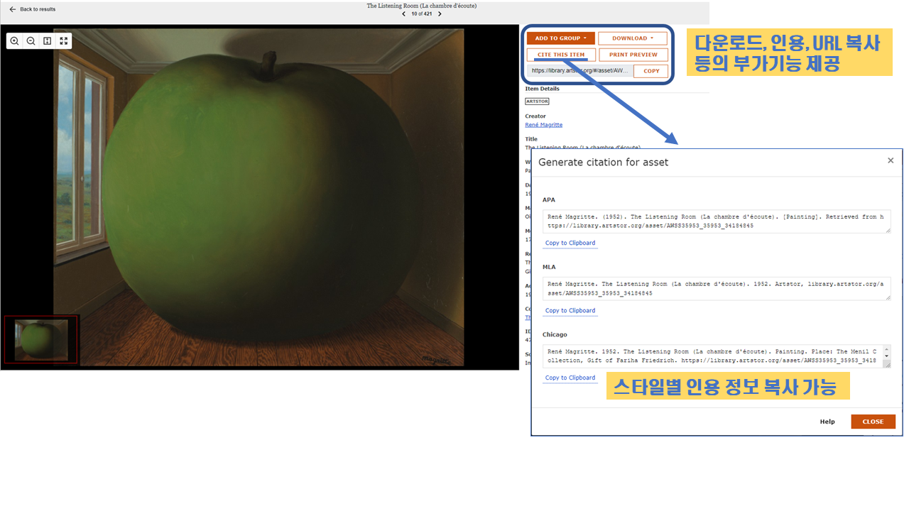 부가기능도 유용하게 활용할 수 있는데요, 해당 자료의 다운로드 (개인 로그인 후 다운로드 가능) 외에도 CITE THIS ITEM 이라는 기능을 통해 스타일별 참고문헌 양식을 제공하고 있어, 과제에 이미지를 활용한 후 참고문헌을 작성할 때에도 간편하게 활용할 수 있습니다.