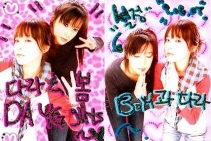 위의 사진들로 볼 수 있듯이 촬영 공간 외부에 터치화면과 터치펜이 있고, 제한 시간 동안 원하는 대로 화려하게 꾸밀 수 있었습니다. (고양이 귀를 그리고 친구와 저의 이니셜을 썼던 기억이 어렴풋하게 나네요.) 그러다 제한 시간이 끝나면 꾸미기를 중단한 채로 결과물이 나오곤 했죠.