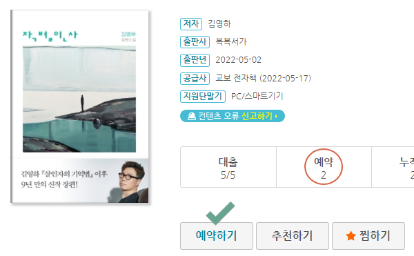 북큐브교보문고 전자도서관 연장 여부 O (1회) X 자료예약 전권 대출 중인 경우