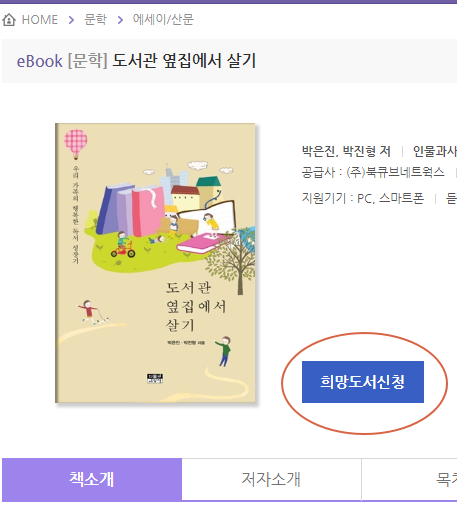 - 전자책 사이트에서 원하는 도서를 검색 후 '희망도서신청' 클릭