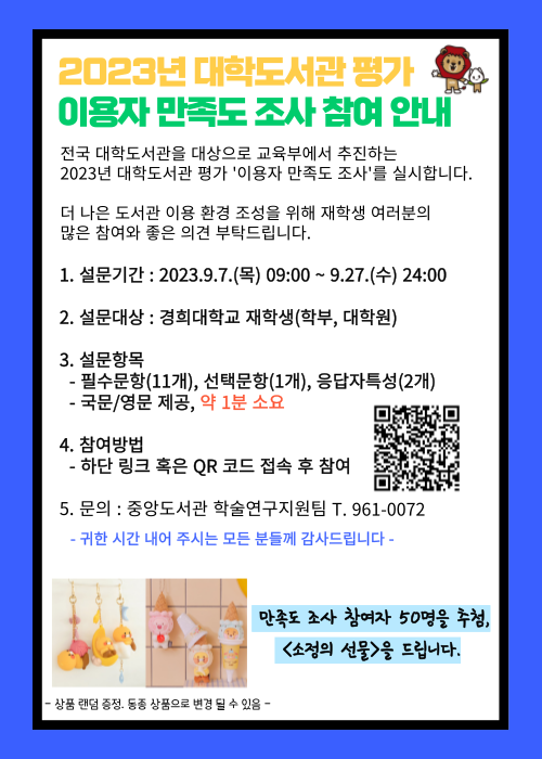 2023년 대학도서관 이용자 만족도 조사 안내(9.7[목]~9.27[수])도서관 소식 2023. 9. 12. 10:17