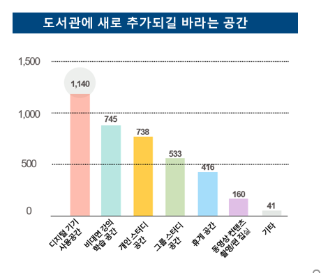 2022년 <가장 선호하는 열람실 공간>로는 약 5년 전 환경개선된 '제1열람실'과 '제3열람실'이 노후화된 제2열람실/제4열람실보다 우위를 차지하였으며, <도서관에 새로 추가되길 바라는 공간> 으로는 '디지털 기기 사용 공간', '비대면 강의 학습 공간'이 1위와 2위, 개인스터디공간, 그룹스터디 공간, 휴게 공간이 그 뒤를 이었습니다.