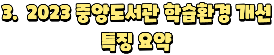다수의 개선 요구들을 최대한 점검하고, 기능적, 심미적으로 충족시킬 수 있는 열람실 공간을 조성하고자 노력하였습니다. 2023년 열람실 환경개선 공사에서 우선순위를 두고 중점 개선된 사항은 다음과 같습니다.