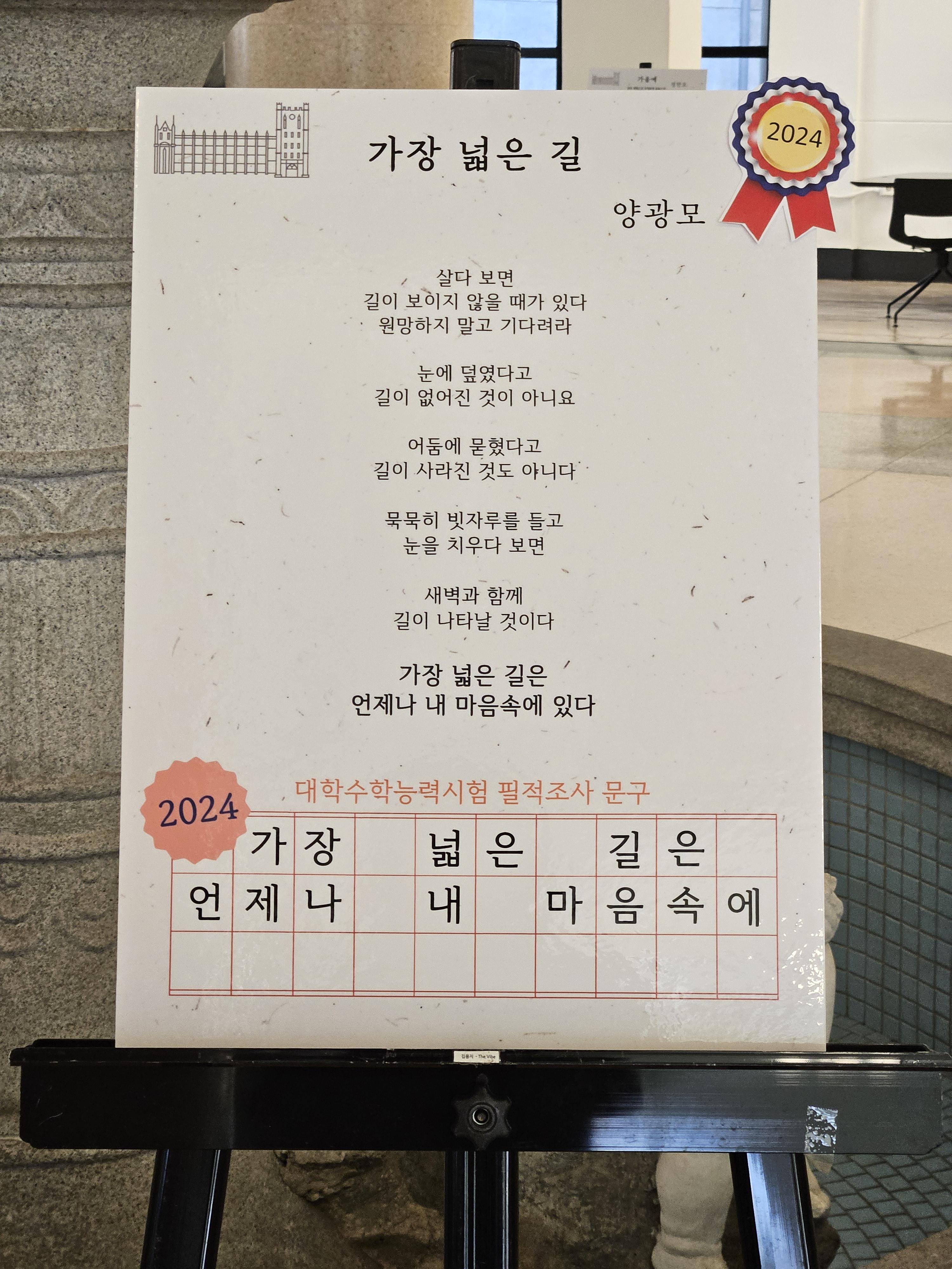 2024학년도 수능 필적확인문구인 "가장 넓은 길은 언제나 내 마음 속에"가 1위로 선정되었습니다.