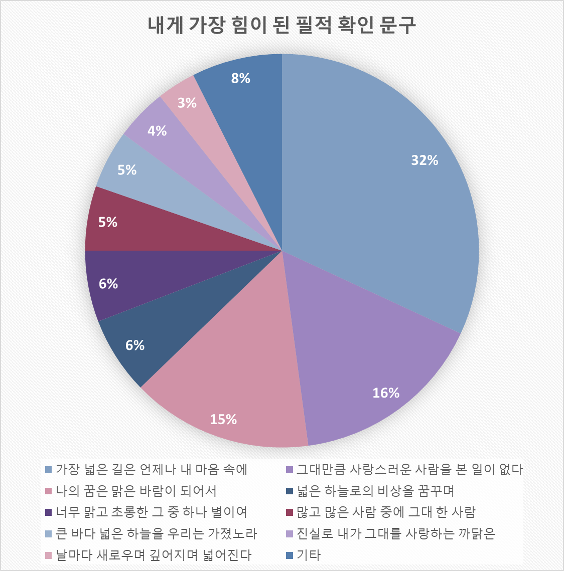 마지막으로 경희대학교 학생들이 꼽은 내게 가장 힘이된 필적확인문구 비율을 그래프로 보여드리겠습니다.