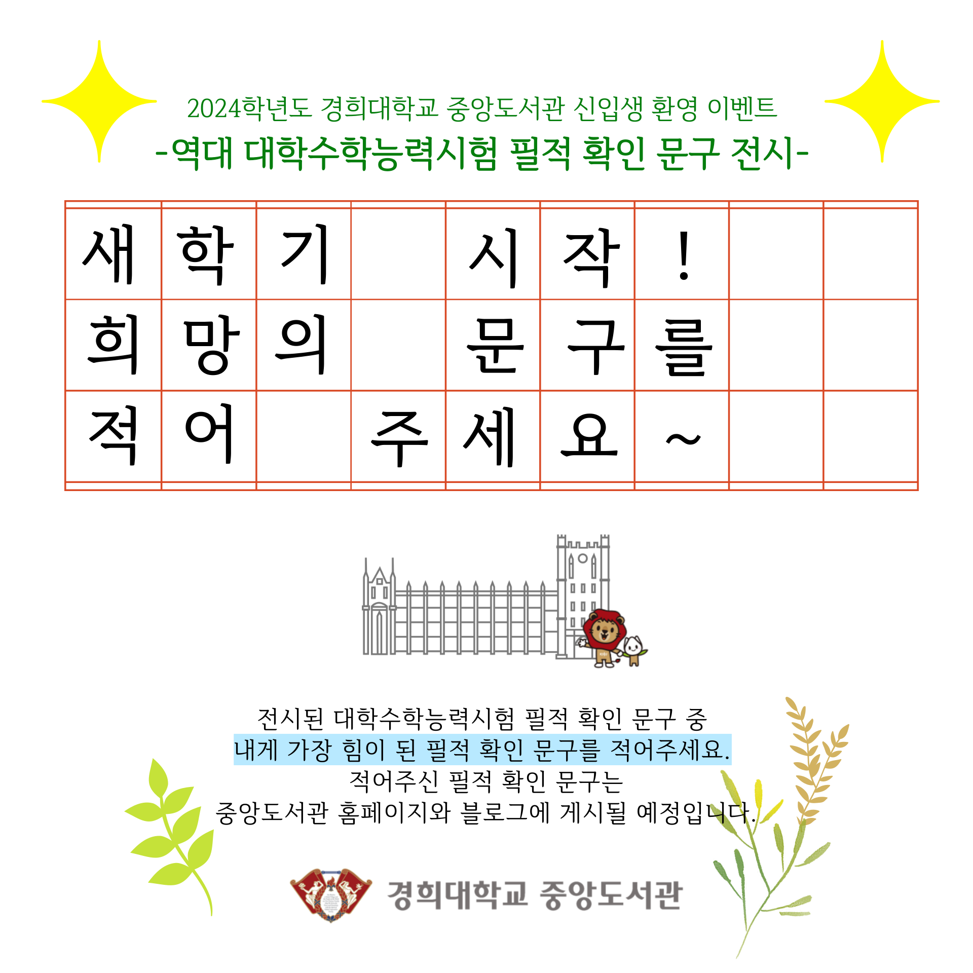 [도서관 차트톡] 경희대 학생들에게 가장 힘이 된 필적 확인 문구는?도서관 차트톡 2024. 4. 11. 11:53