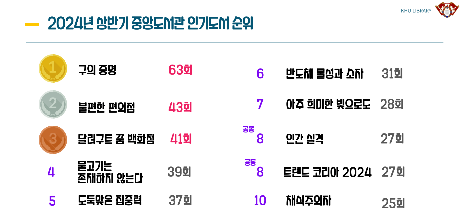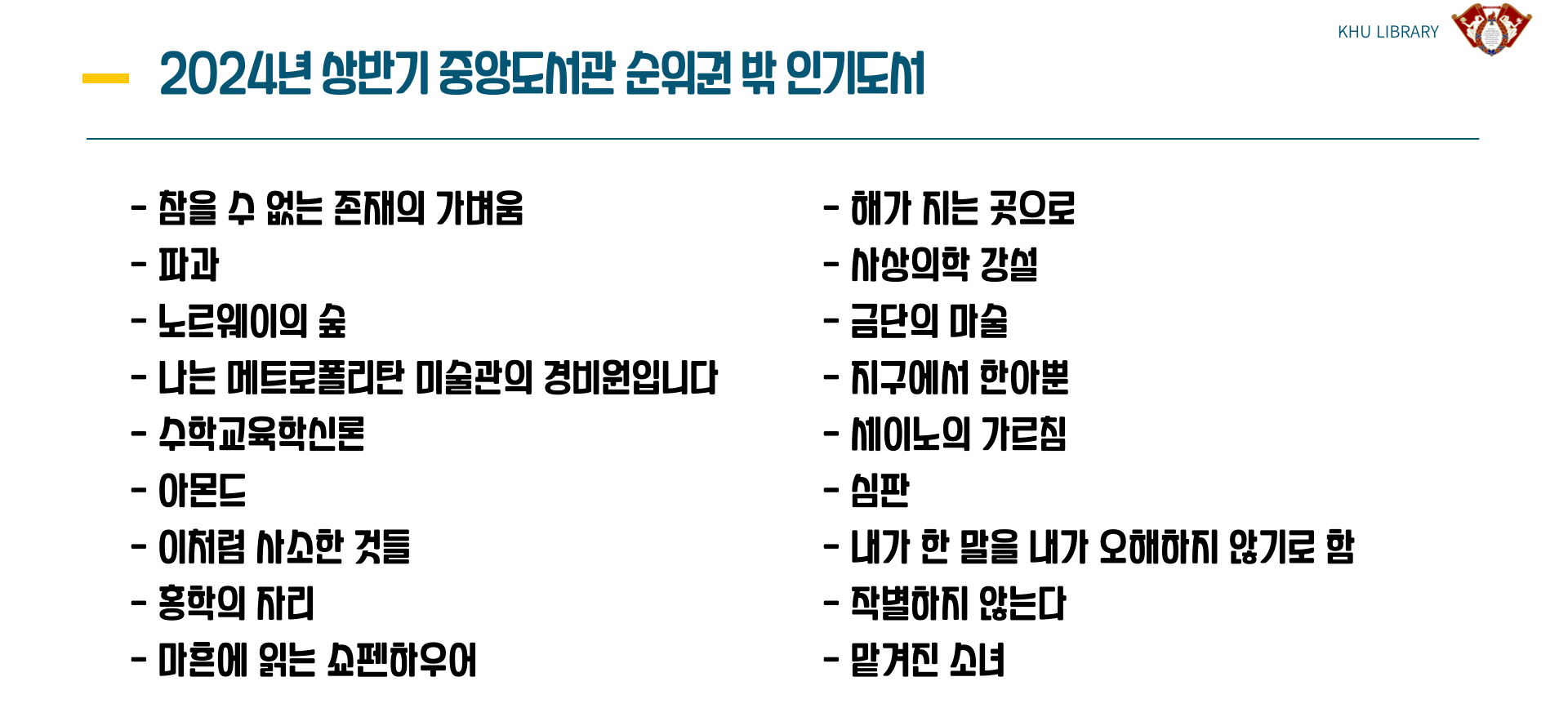 2024년 1학기 경희인들이 많이 읽은 인기도서를 소개합니다.