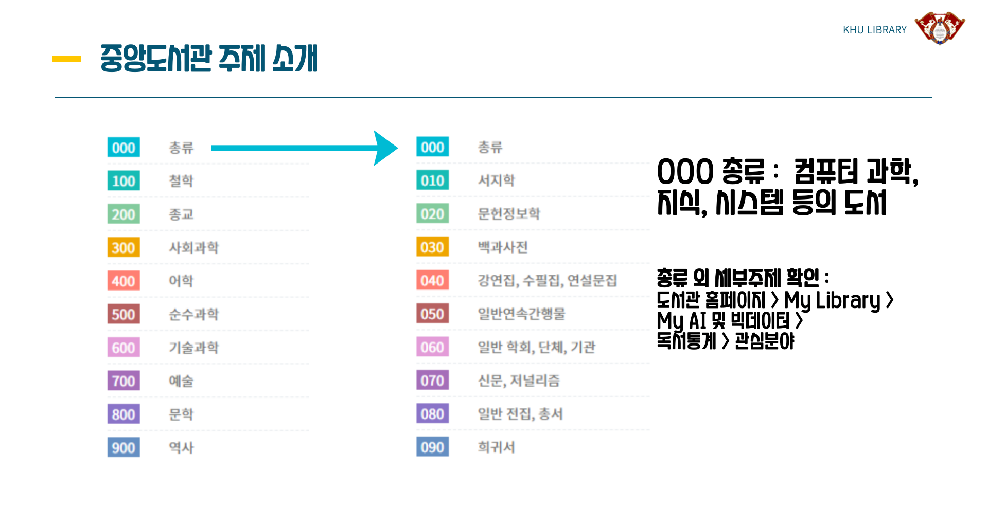 000번부터 999번까지 각 주제별로 도서가 분류되어 있습니다.
