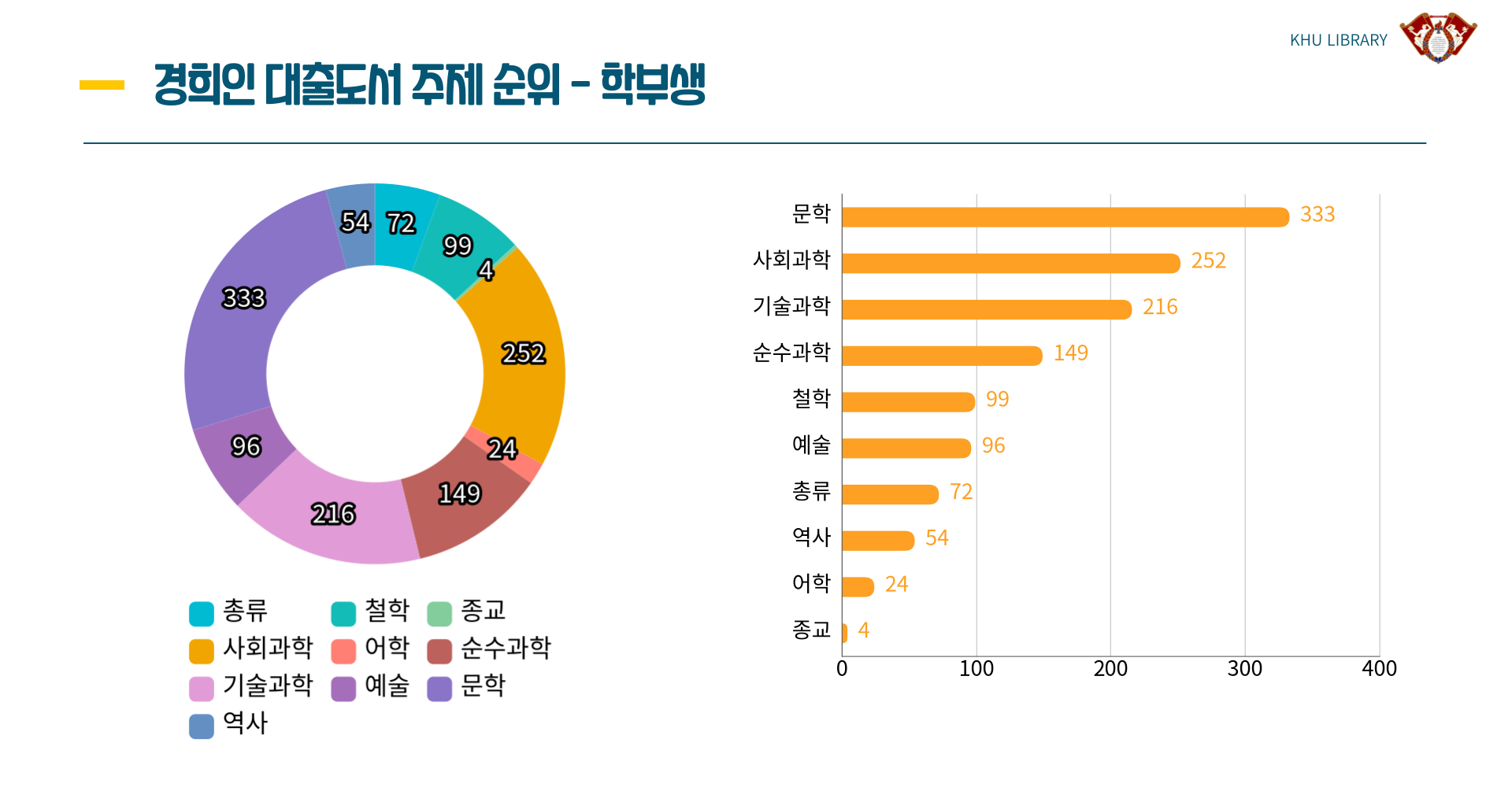 학부생과 마찬가지로 문학, 사회과학, 기술과학이 많이 대출되었습니다.