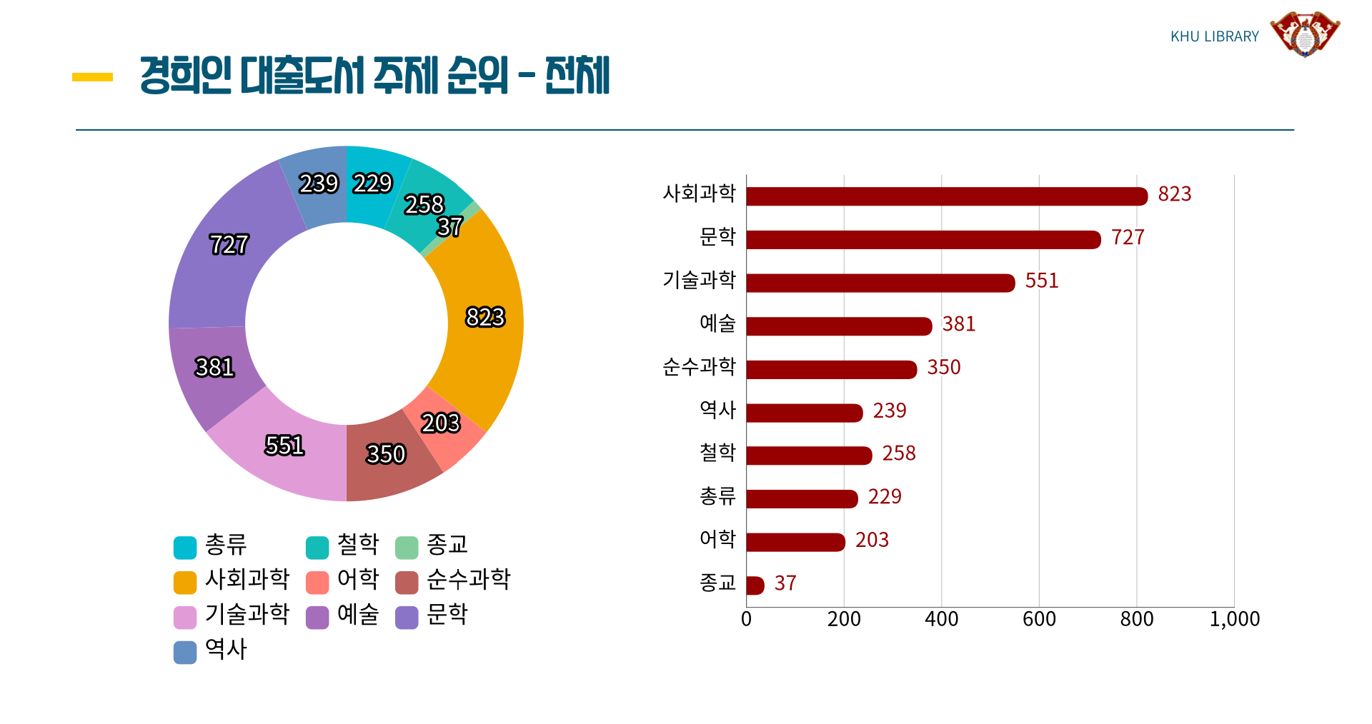 문학, 사회과학, 기술과학 순으로 많이 대출하였네요.