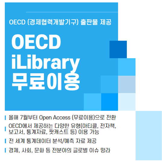 - 도서관 홈페이지를 통한 접속 : 홈페이지 > 자료이용 > 데이터베이스 > OECD iLibrary
