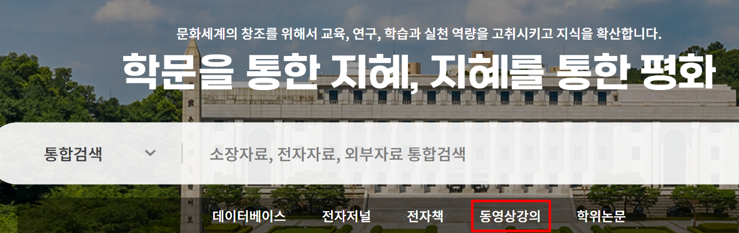 도서관 홈페이지 로그인 -> 메인 검색 창 하단 동영상 강의 텍스트 클릭