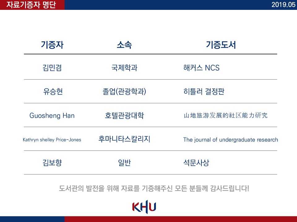 2019년 5월 도서관 자료기증자 명단도서관 소식 2019. 6. 3. 13:11