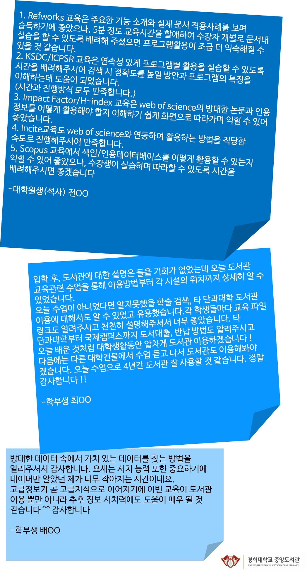 응답해주신 후기내용을 참고하여, 2학기에는 더 알찬 학술정보활용교육을 준비하겠습니다!