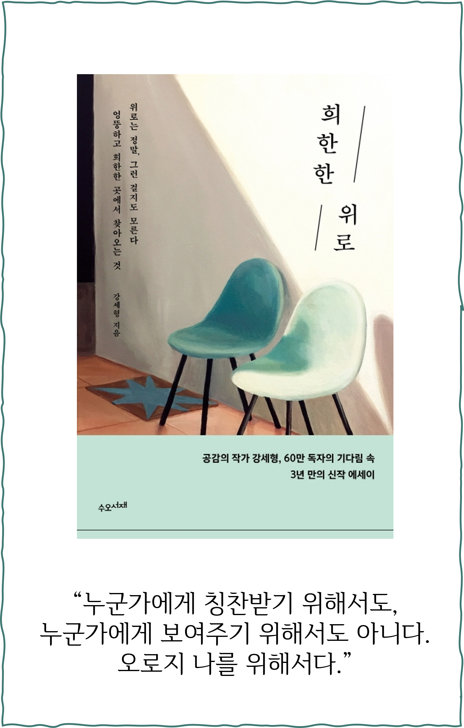 남에게만 하는 것이 위로가 아니죠. 나 자신을 위해서도 일상 곳곳에 작고 아름다운 위로들이 심어져 있어야 해요. 삶 속에서 오직 나만이 온전히 느낄 수 있는 위로를 발견한다면, 그리고 그것을 소중히 여겨 잘 품고 있다면. 덕분에 우리는 조금 더 괜찮아질 수 있을 거예요.