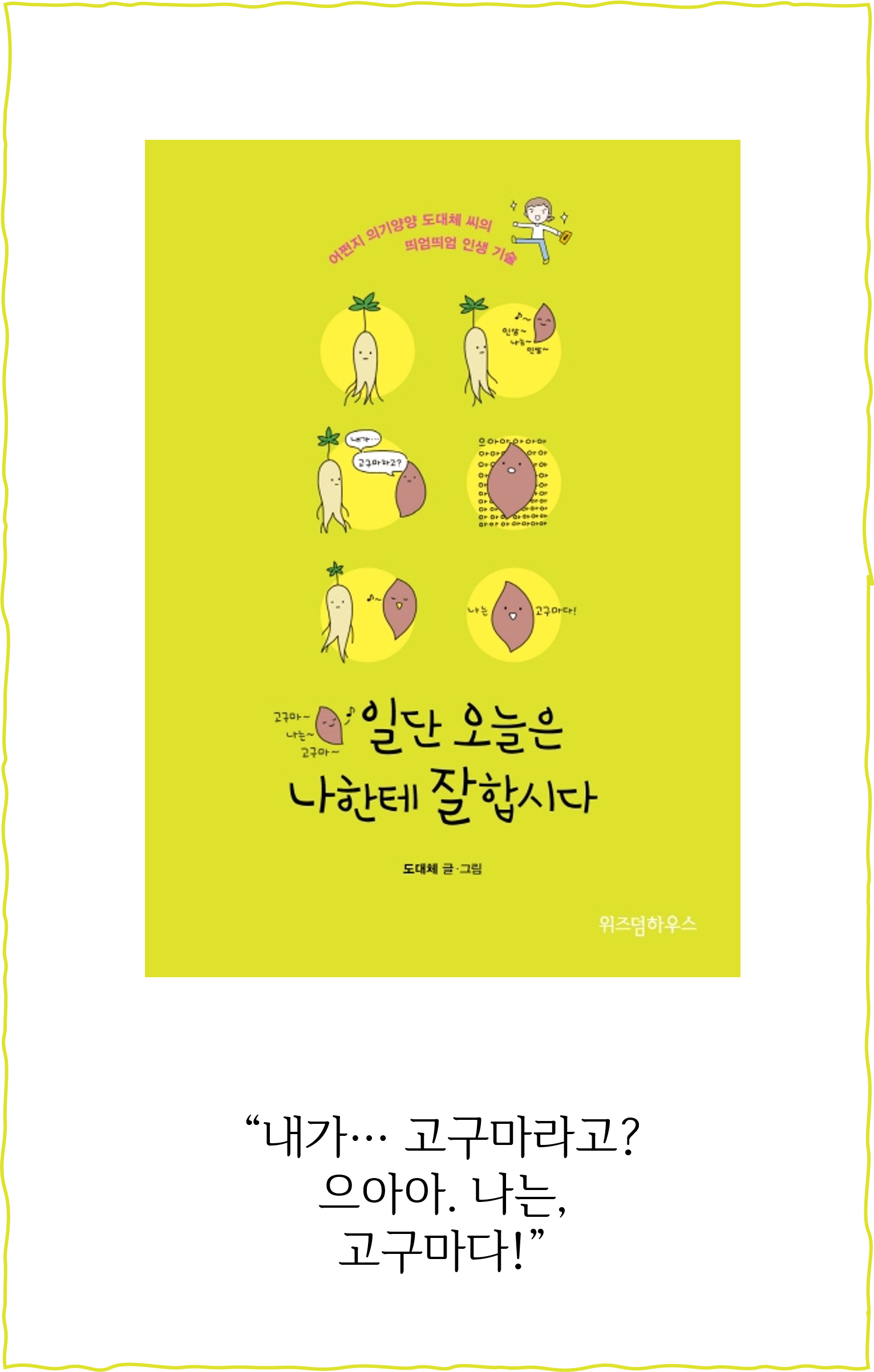 그러기 위해서는 현재의 상황을 잘 받아들이고 이해하여 스스로를 다독일 수 있는 여유로움이 우리에게 필요합니다. 인삼 밭에서도 홀로 행복하게 살고 있는 이 고구마처럼 말이에요. 주변 상황이 어떻게 돌아가든, 나는 일단 나에게 잘하면 된다는 것이죠. 나는 누구인지, 나에게 무엇을 해 주면 좋을지 한번 잘 생각해 보세요.