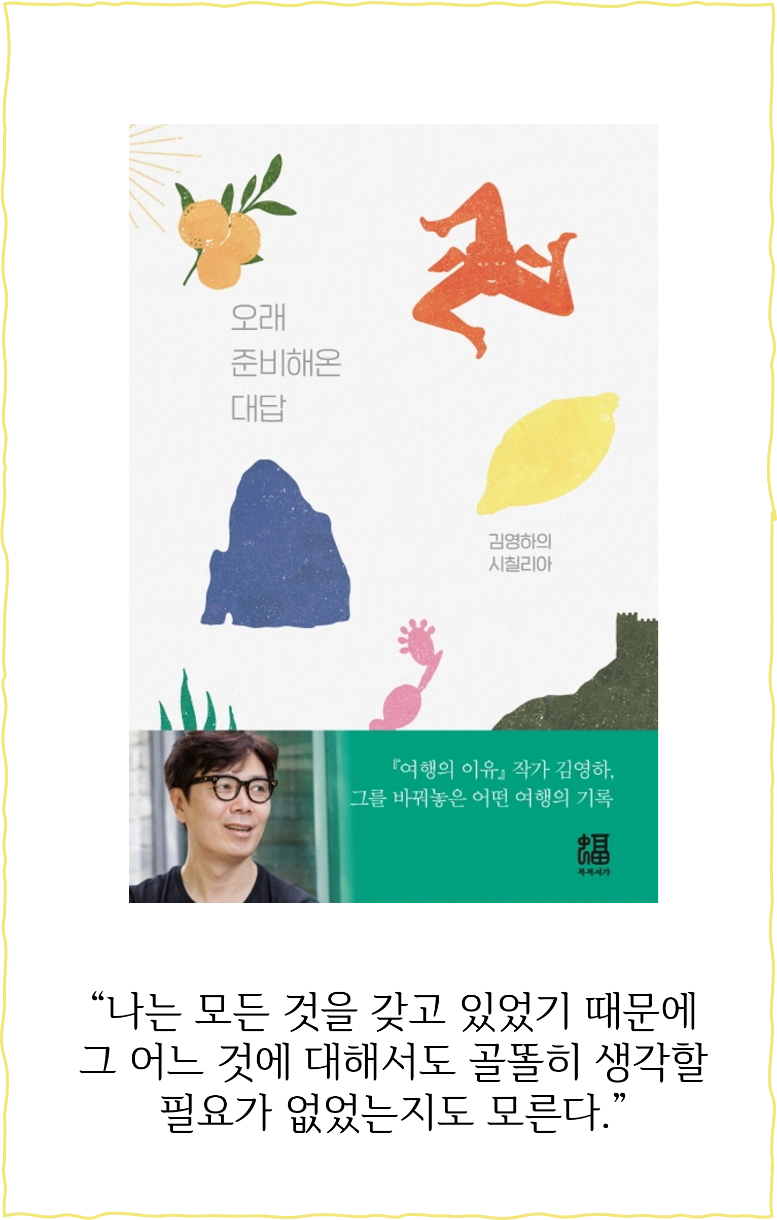 내가 잃어버린 것을 기억하고 지금 주어진 것에 오롯이 집중하며 살아가는 일, 어렵게 들리지만 사실은 아주 어렵진 않습니다. 우리가 여행을 떠날 때 언제나 그랬듯 말이에요. 김영하의 시칠리아 여행기를 함께 읽으며 지금 나의 곁에 무엇이 있었는지 천천히 꼽아보는 건 어떨까요?