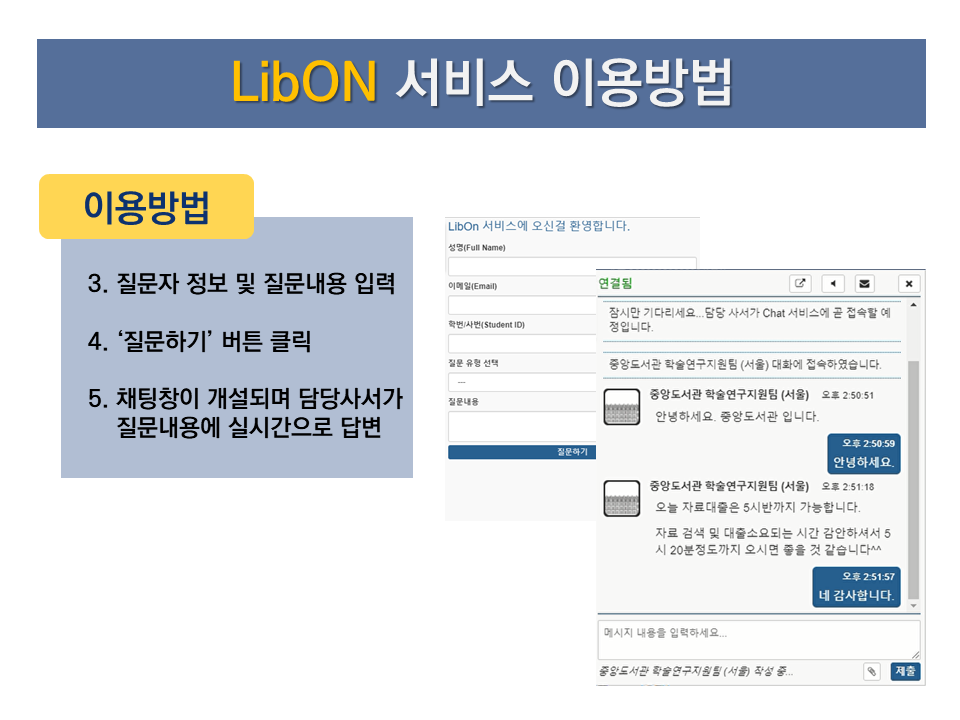 경희대 도서관에서는 신속하고 정확한 응대서비스를 제공하고자, 비대면 실시간 질의응답 채팅 서비스인 LibON 서비스를 2019년 12월부터 실시하고 있습니다.