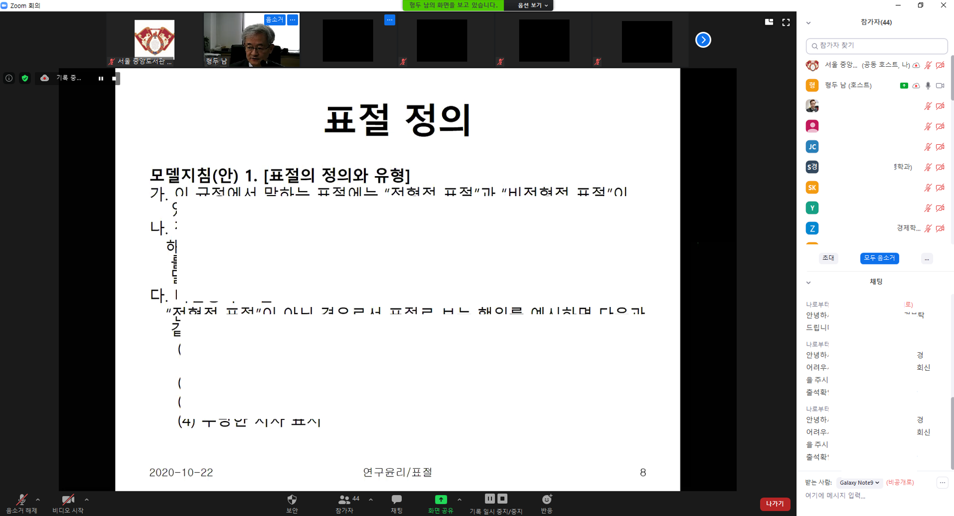 황은성 교수님 온라인 화상강의 화면