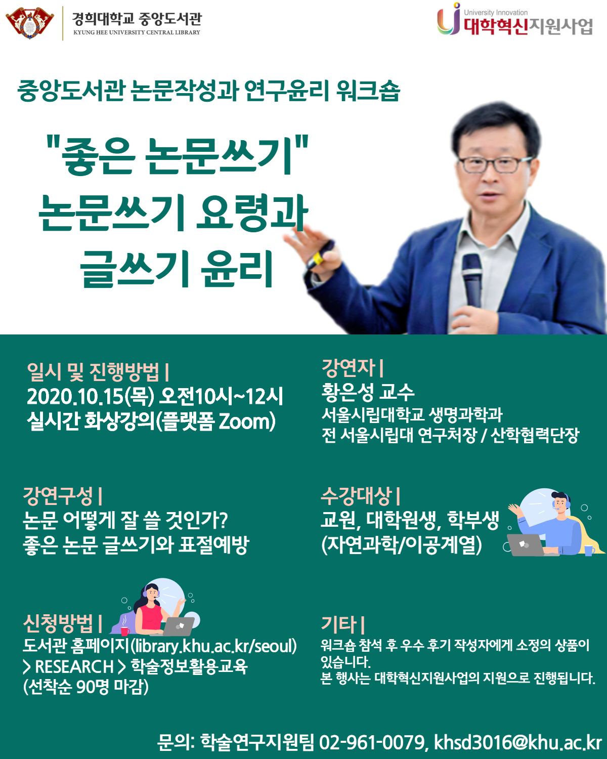 중앙도서관에서는 10월 15일(목) 오전 10시, 서울시립대학교 생명과학과 황은성 교수님을 모시고 "온라인" 워크숍을 진행하였습니다. 도서관에서 최초로 시행되는 온라인 워크숍이었고 이른 시간에 진행되었음에도 불구하고, 많은 경희인들이 참석하고 관심을 보여주었습니다.