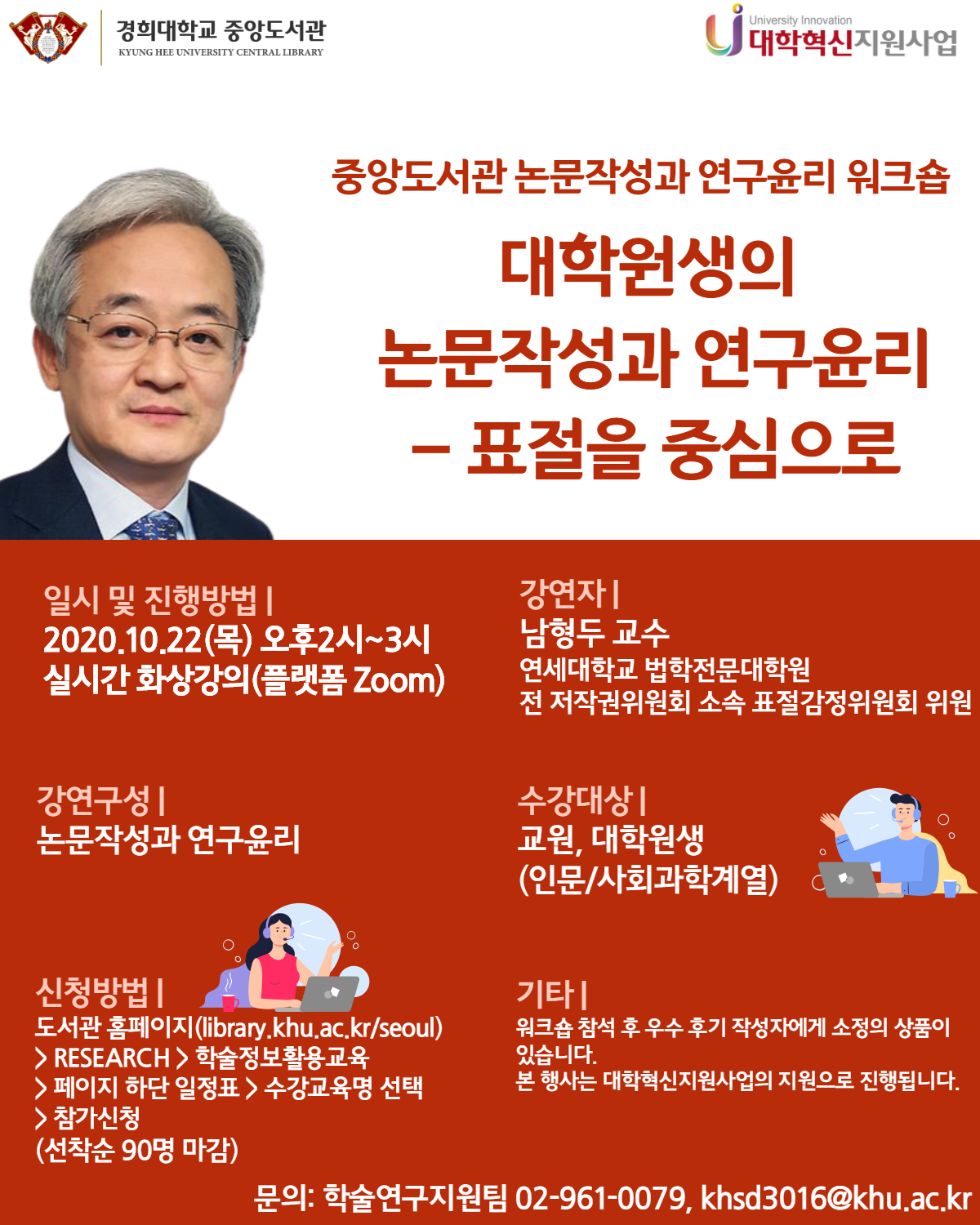 10월 22일(목)의 경우 15일 워크숍과 달리 인문/사회과학계열 연구자들을 대상으로 진행되었습니다. 연세대학교 법학전문대학원 남형두 교수님을 모시고 "대학원생의 논문작성과 연구윤리-표절을 중심으로" 라는 주제로 온라인 강연을 개최하였습니다.