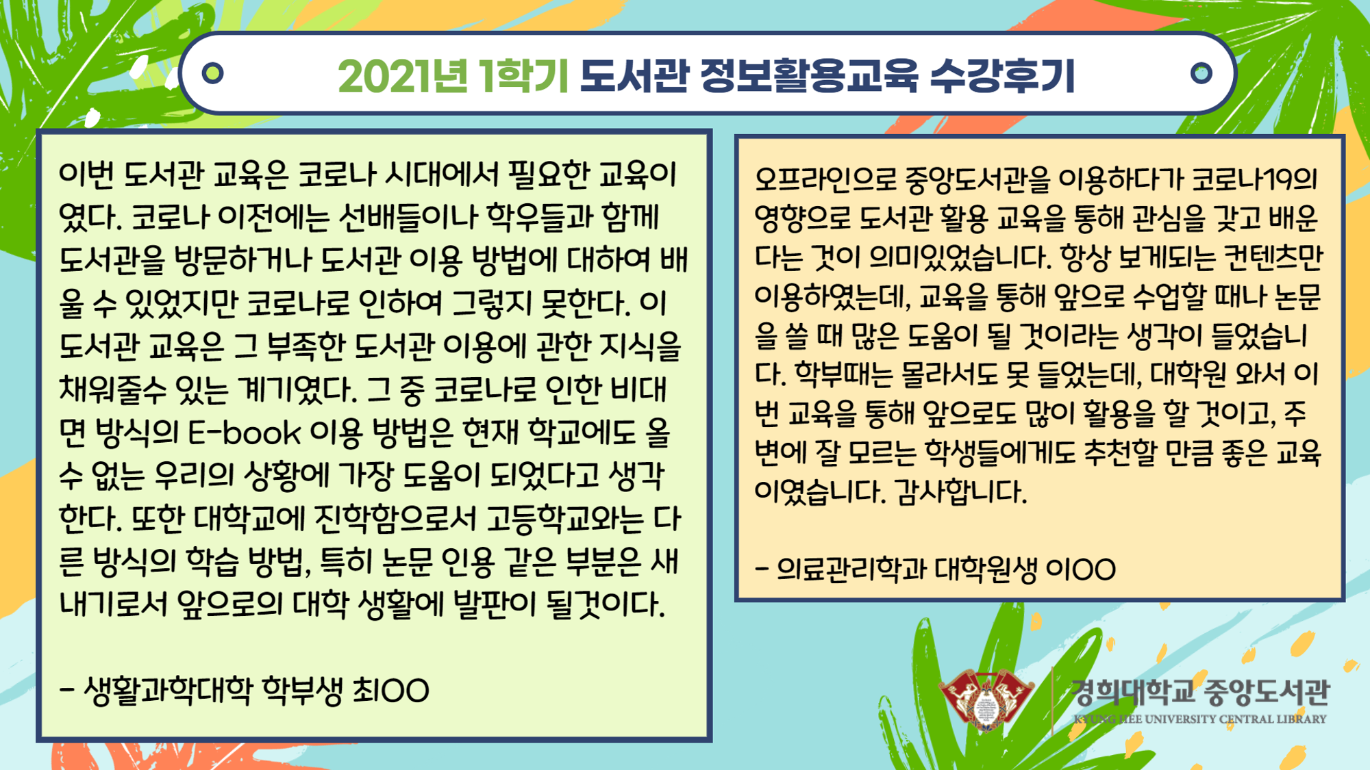 2021년 1학기 도서관 '온라인' 정보활용교육 수강후기도서관 소식 2021. 6. 22. 11:00