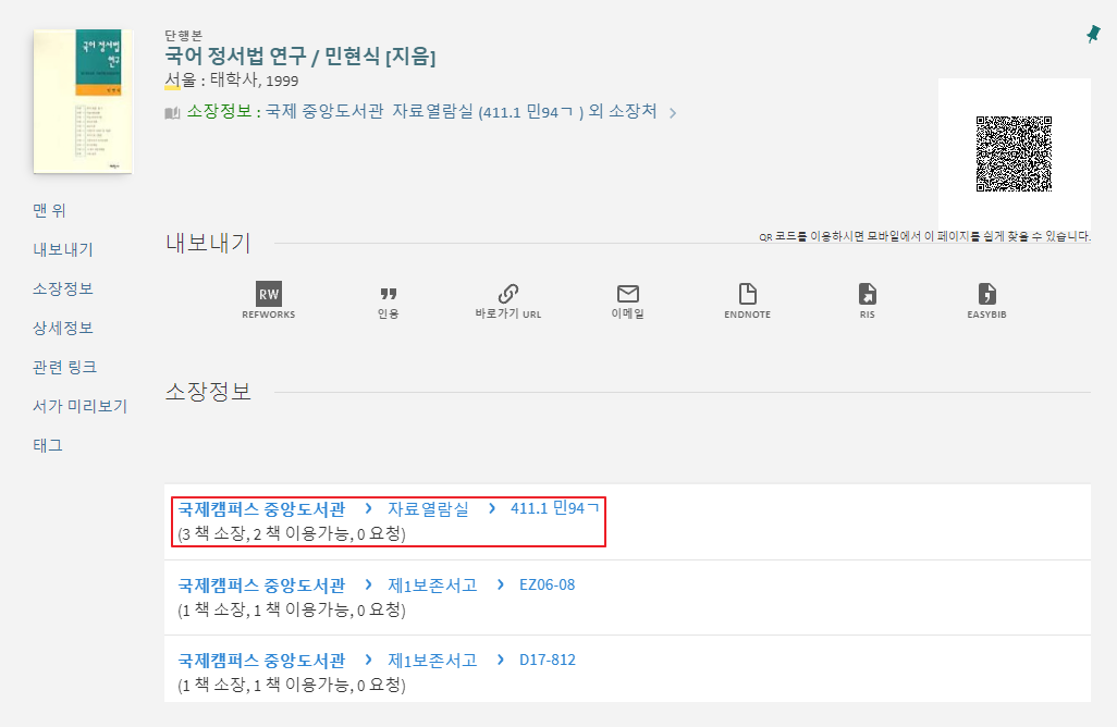 모든 도서가 국제캠퍼스에 소장되어 있다고 나오네요.