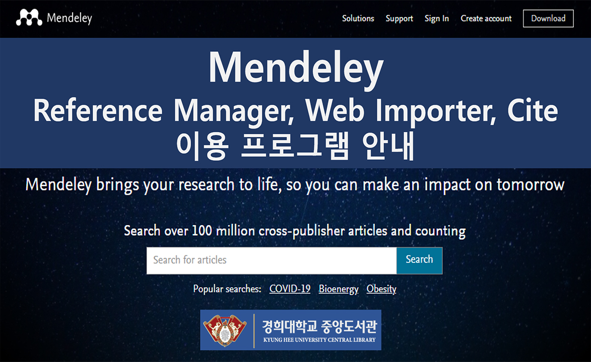 대표적인 서지관리도구! Mendeley(멘들레이)에 대한 간단한 소개와 이용 프로그램에 대해 안내합니다.